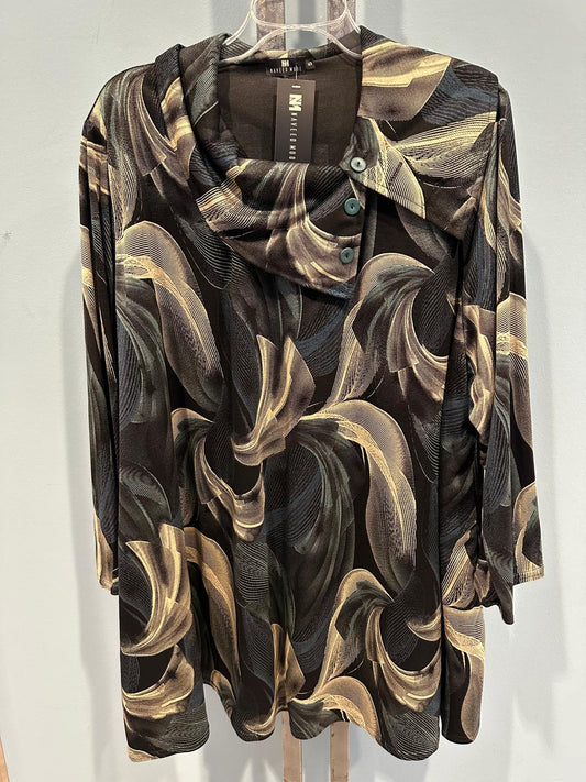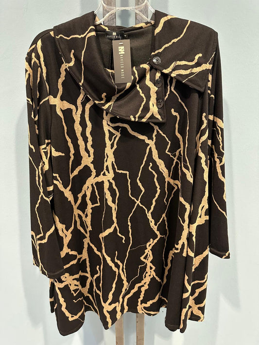 Warme Langarm-Tunika mit Dunklem Abstraktmuster (Braun, Rostrot, Gold) – Erhältlich als Schalkragen- oder Rundhals-Bluse