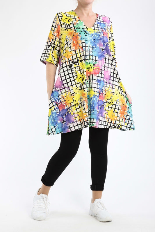 Tailliertes Tunika-Top mit Rundhalsausschnitt und 3/4-Ärmeln mit abstraktem, auffälligem Linienmuster – ideal für dehnbares Oberteil