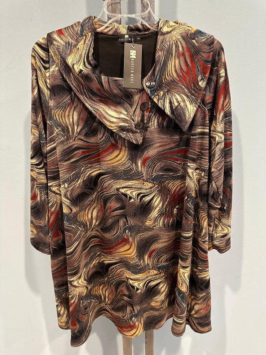 Warme Langarm-Tunika mit Dunklem Abstraktmuster (Braun, Rostrot, Gold) – Erhältlich als Schalkragen- oder Rundhals-Bluse