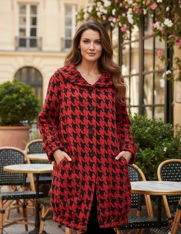 Klassisch: Rote Longjacke mit Hahnentrittmuster | Oversize-Mantel mit Struktur und auffälligem Kragen