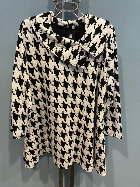 T-shirt mit Hahnentrittmuster und Wasserfallkragen