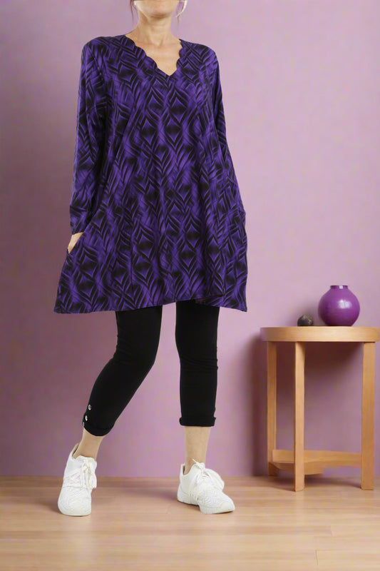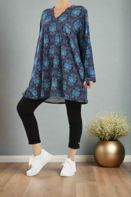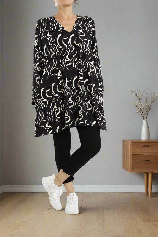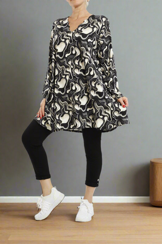 Tailliertes Tunika-Top mit Rundhalsausschnitt und 3/4-Ärmeln mit abstraktem, auffälligem Linienmuster – ideal für dehnbares Oberteil