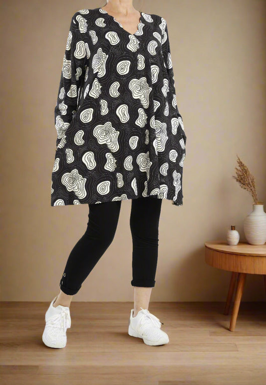 Sommerlich & Elegant: Tunika Kleid Schwarz-Weiß mit Blüten-Print