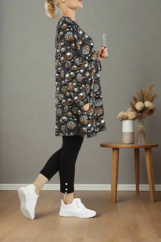 Elegante Langarm-Tunika mit Braun-Gold Abstraktmuster – Wählbar mit Schalkragen oder Rundhalsausschnitt