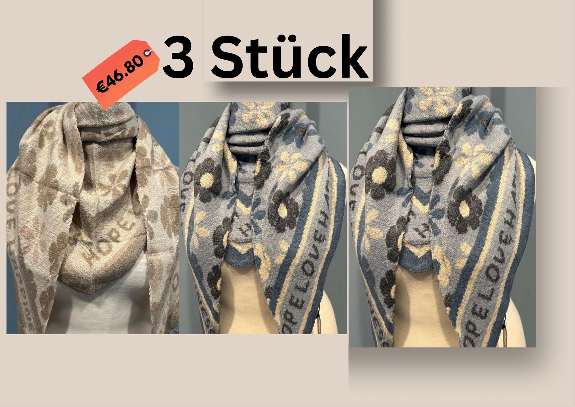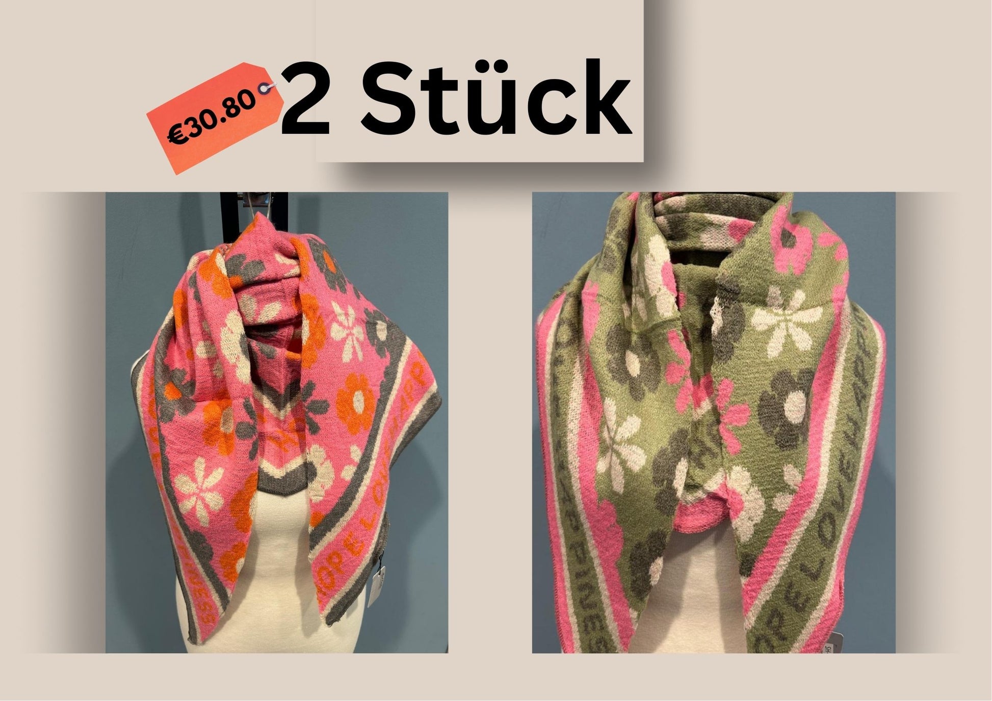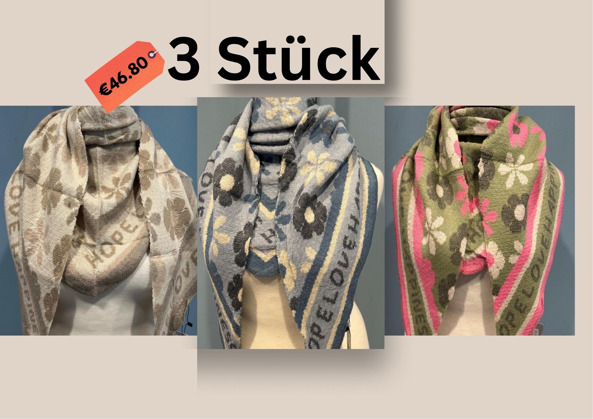 Jeder Schal kostet 17,90 €. Sie sind in vielen verschiedenen Farben und Mustern erhältlich.