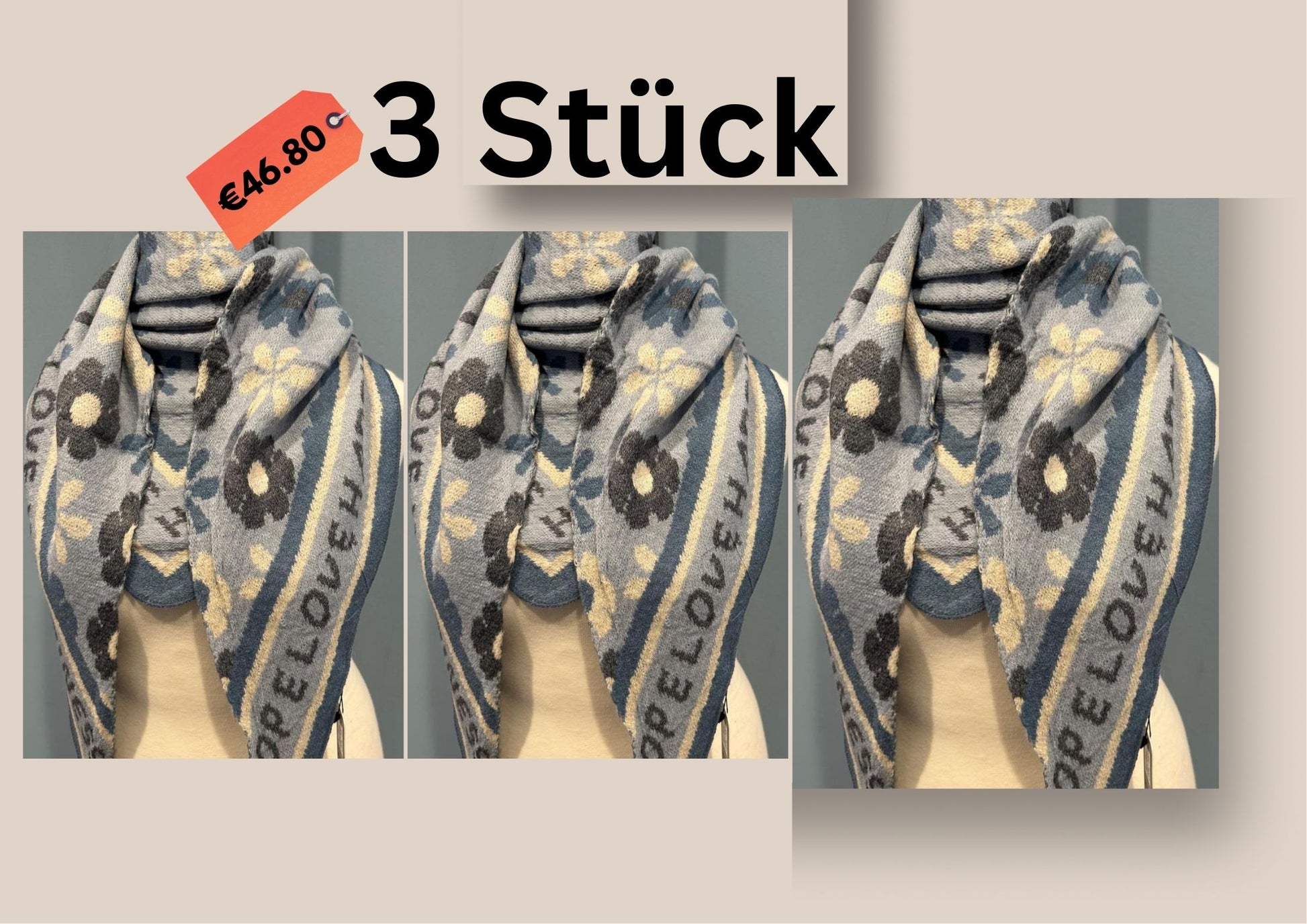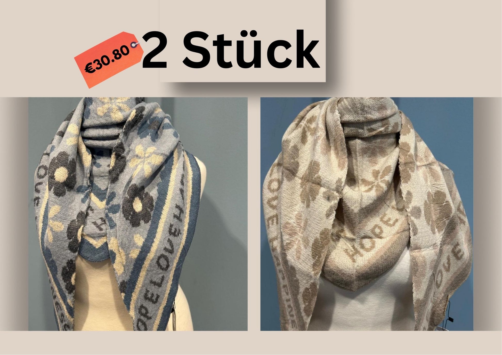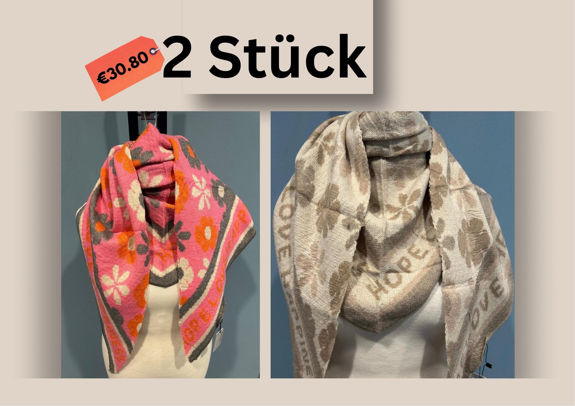 Jeder Schal kostet 17,90 €. Sie sind in vielen verschiedenen Farben und Mustern erhältlich.