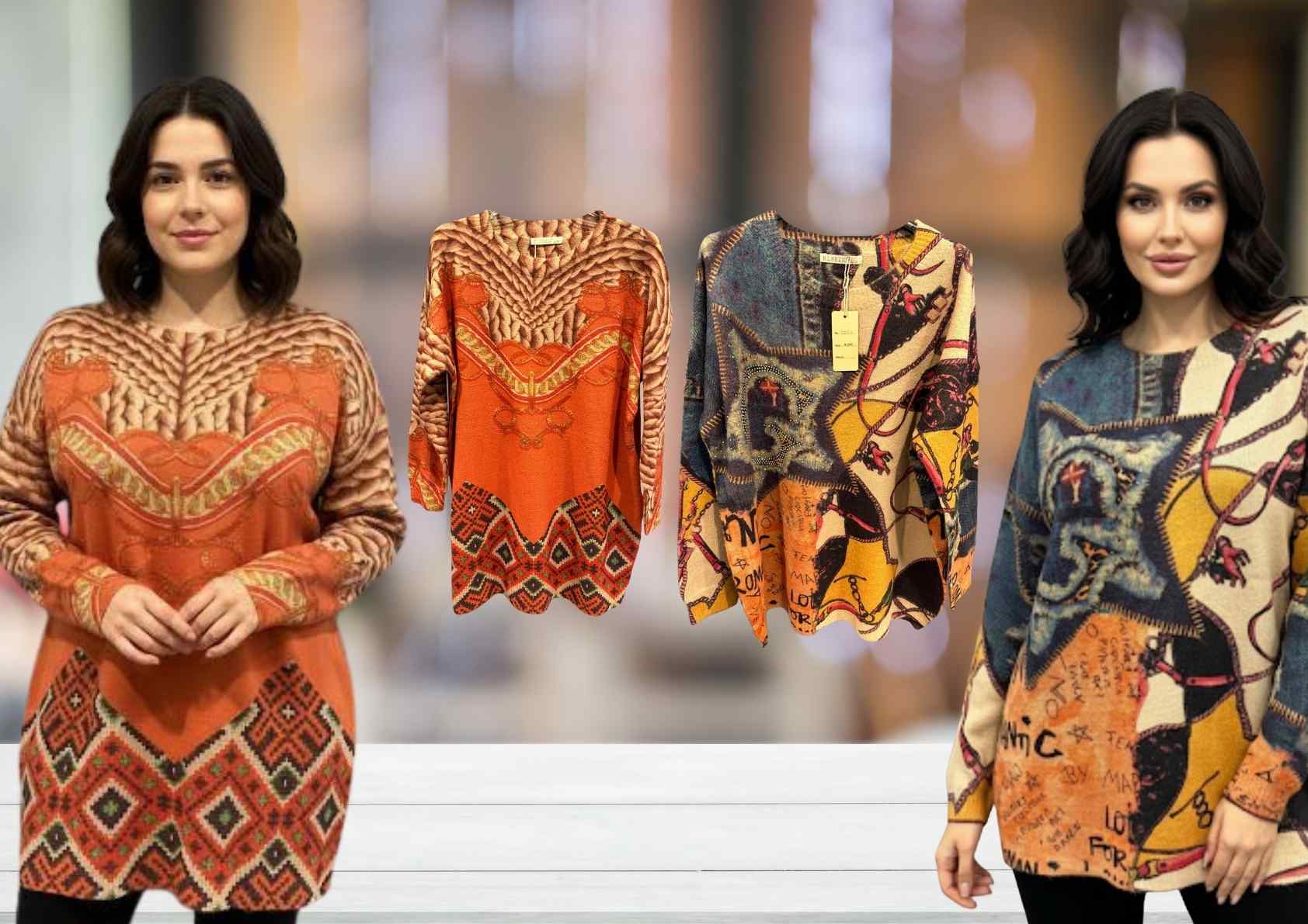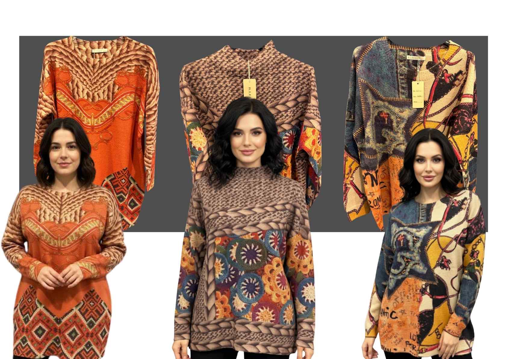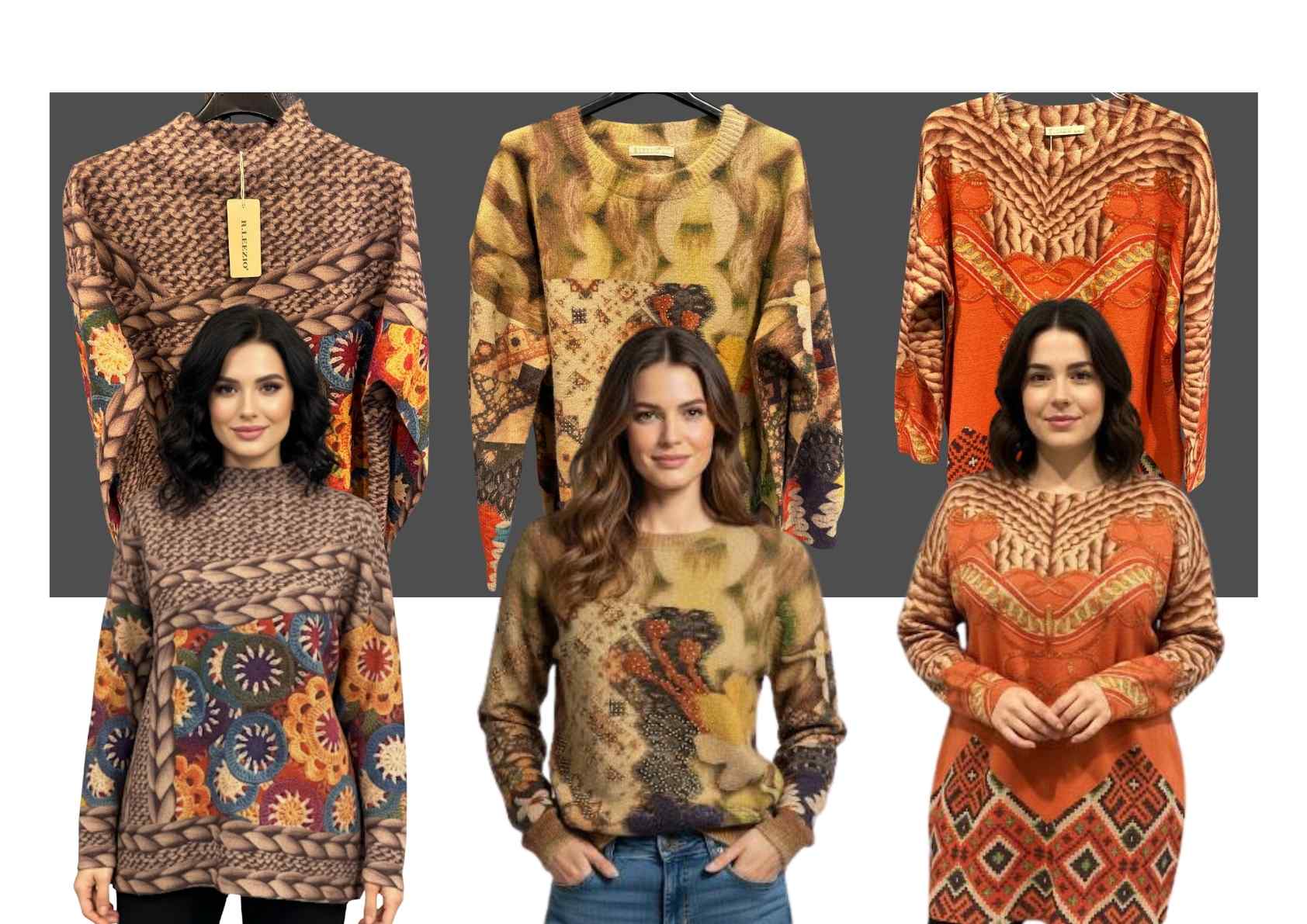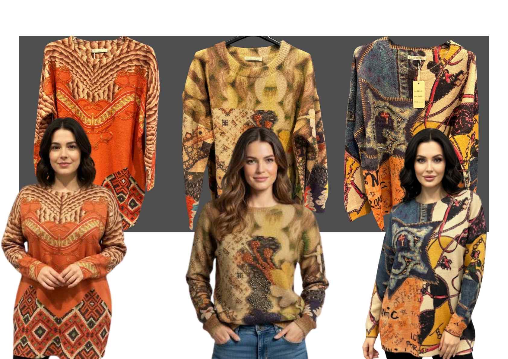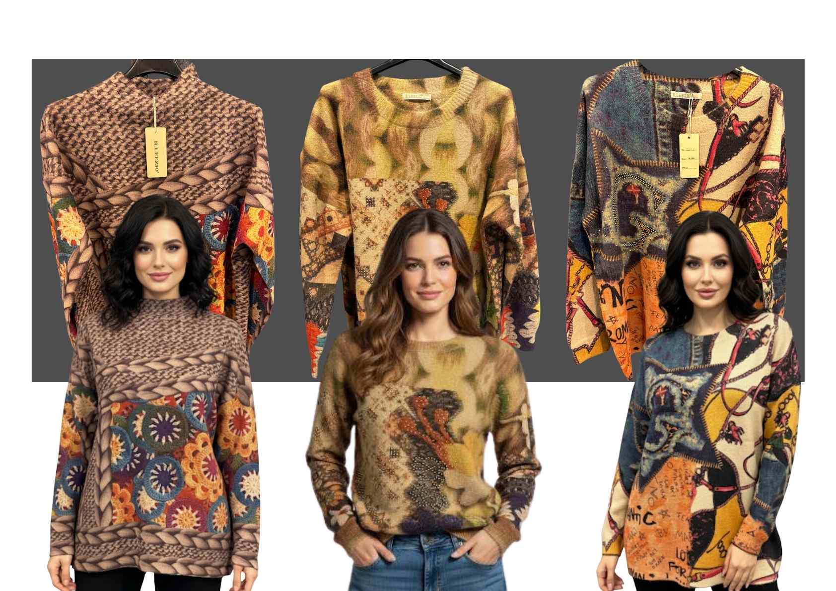 • Einzigartige Designs: Jeder Pullover ist ein echtes Kunstwerk. Von auffälligen Patchwork-Mustern und floralen Elementen bis hin zu eleganten Ketten- und Zopfstrick-Prints – unsere Pullover setzen ein modisches Statement.