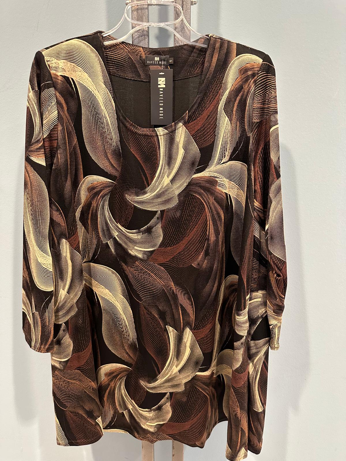 Discover pure elegance with our exclusive long-sleeved tunic from the Naveed fashion collection . This style combines luxurious brown and gold tones in a captivating abstract pattern that instantly catches the eye and elevates your look to a new level.