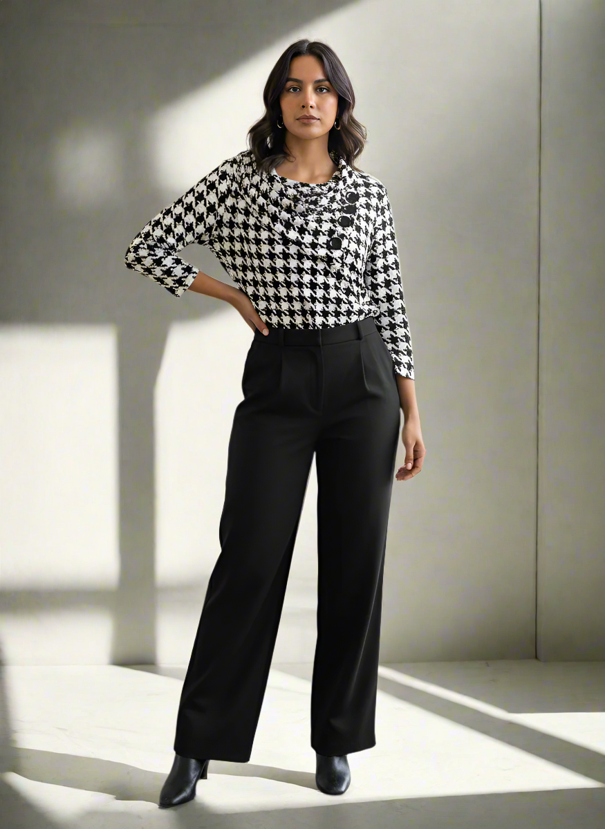 Setzen Sie ein stilvolles Statement mit dieser eleganten Bluse, die ein zeitloses schwarz-weißes Hahnentrittmuster aufgreift. Das Oberteil verfügt über einen schmeichelhaften Wasserfallkragen und bequeme 3/4-Ärmel, die für einen mühelosen und dennoch raffinierten Look sorgen. Die taillierte Passform macht es ideal zum Hineinstecken in Hosen oder Röcke. Kombinieren Sie es mit einer schwarzen Stoffhose oder einem Bleistiftrock für ein professionelles Büro-Outfit oder tragen Sie es mit Jeans für einen schicken Freizeitlook.