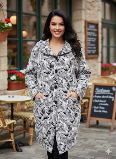 Setzen Sie auf zeitlose Eleganz mit einem modernen Twist! Dieser Schwarz-Weiße Kurzmantel/Lange Strickjacke überzeugt durch sein auffälliges, geschwungenes Wellenmuster. Die strukturierte Qualität und der weiche Kragen machen ihn zum idealen Begleiter für kühle Tage und stilvolle Auftritte.