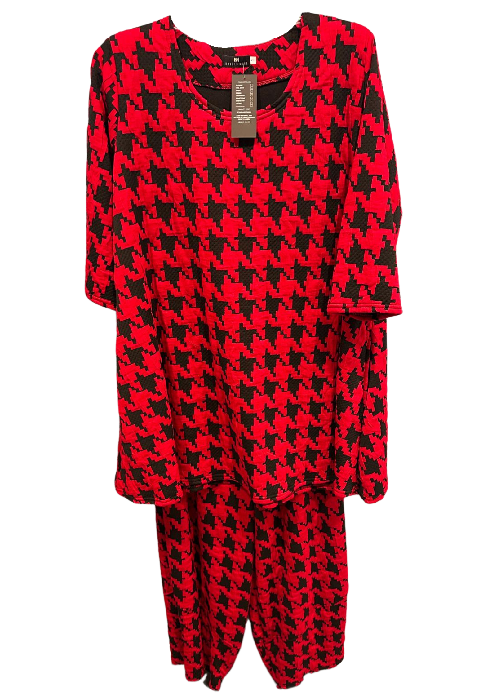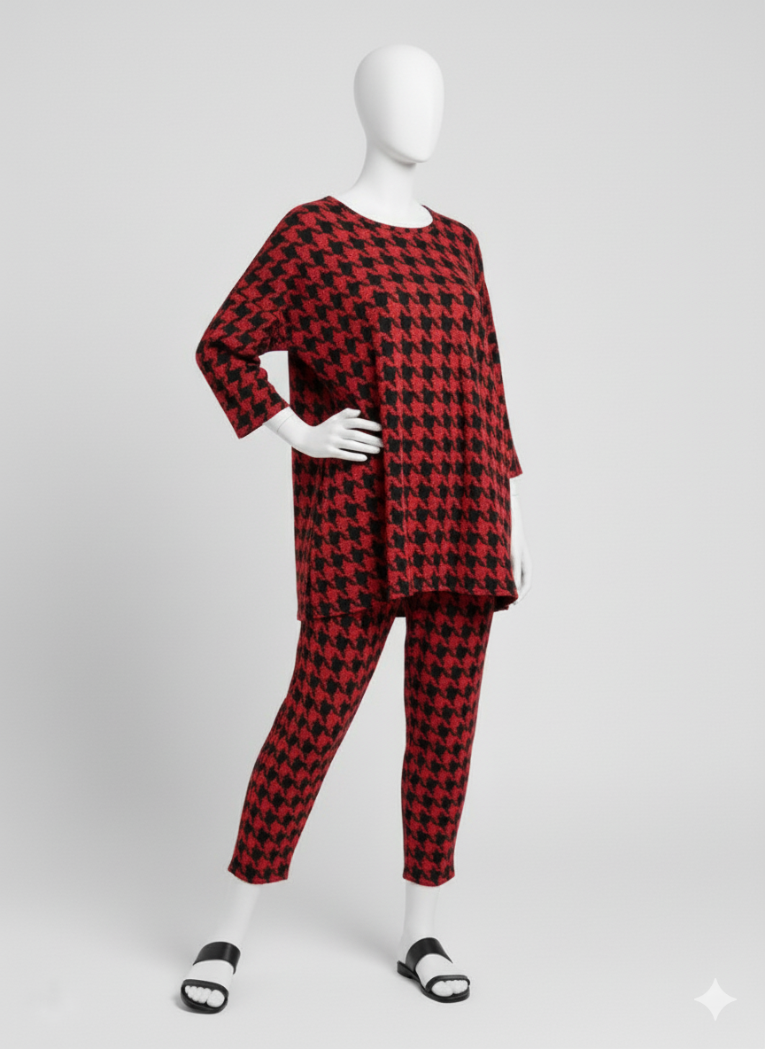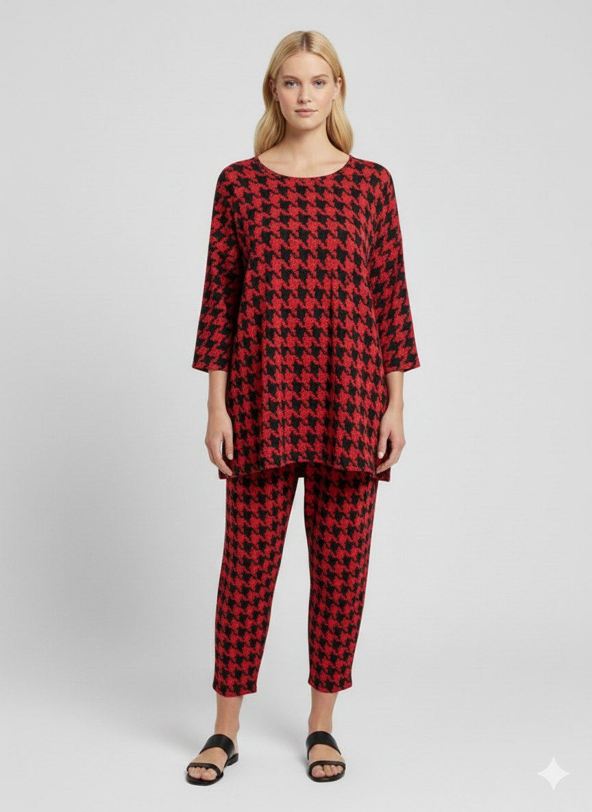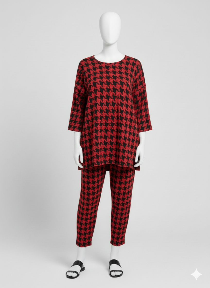 Setzen Sie ein modisches Statement mit klassischem Komfort in diesem stilvollen Zweiteiler-Set. Mit seinem zeitlosen rot-schwarzen Hahnentrittmuster besteht dieses Outfit aus einem lockeren, weit geschnittenen Tunika-Oberteil mit bequemen 3/4-Ärmeln und einer passenden, zulaufenden Hose. Der weiche, atmungsaktive Stoff bietet eine perfekte Mischung aus Gemütlichkeit und mühelosem Stil, was es ideal für entspannte Reisen oder einen schicken Tagesausflug macht. Kombinieren Sie es einfach mit Ihren Lieblings-Sandalen oder -Sneakern für einen vollständigen, eleganten Look.