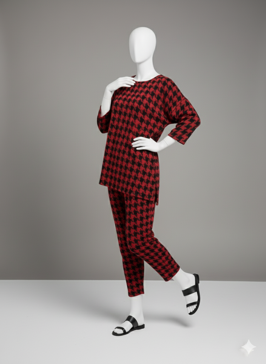 Elegantes Zweiteiler-Set mit rotem Hahnentrittmuster